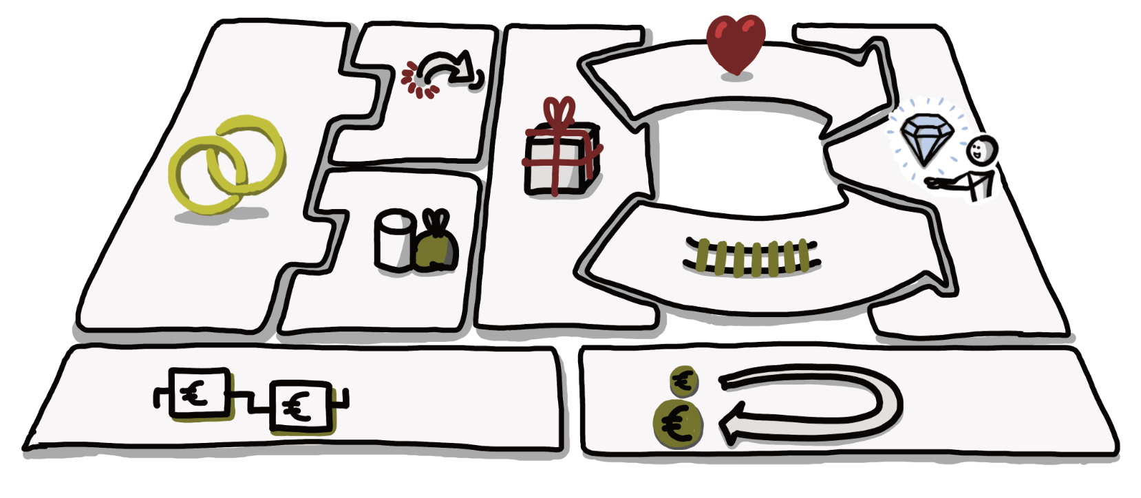 Strukturiert und visualisiert alle wesentlichen Bereiche eines Geschäftsmodells auf einer Seite, um ein gemeinsames Verständnis und eine Basis für Strategie, Innovation und die Verbindung zu unternehmerischen Aspekten zu schaffen.